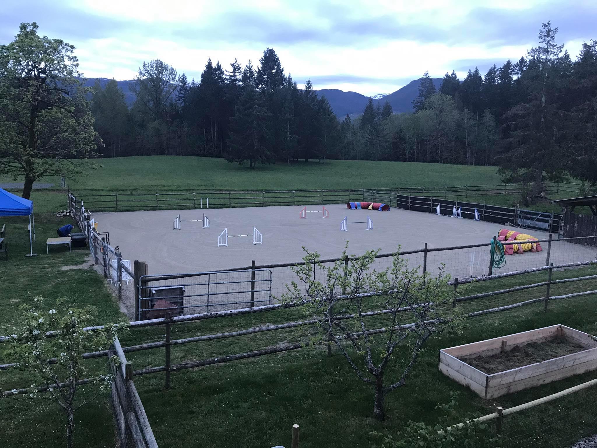 We currently offer two fully fenced and equipped, 3 weather rings for agility, a fully fenced and mesh fenced large round pen (for containment, freedom & success), many individually fenced fields to run, play, and cart, a wooded and trailed area around a huge pond that our dogs and some of the horses love to swim in.